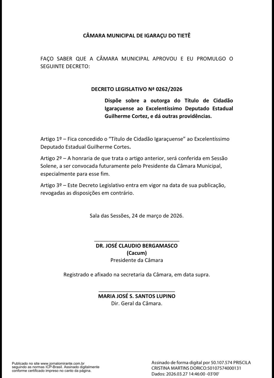 CÂMARA MUNICIPAL DE IGARAÇU DO TIETÊ - DECRETO Nº 0262