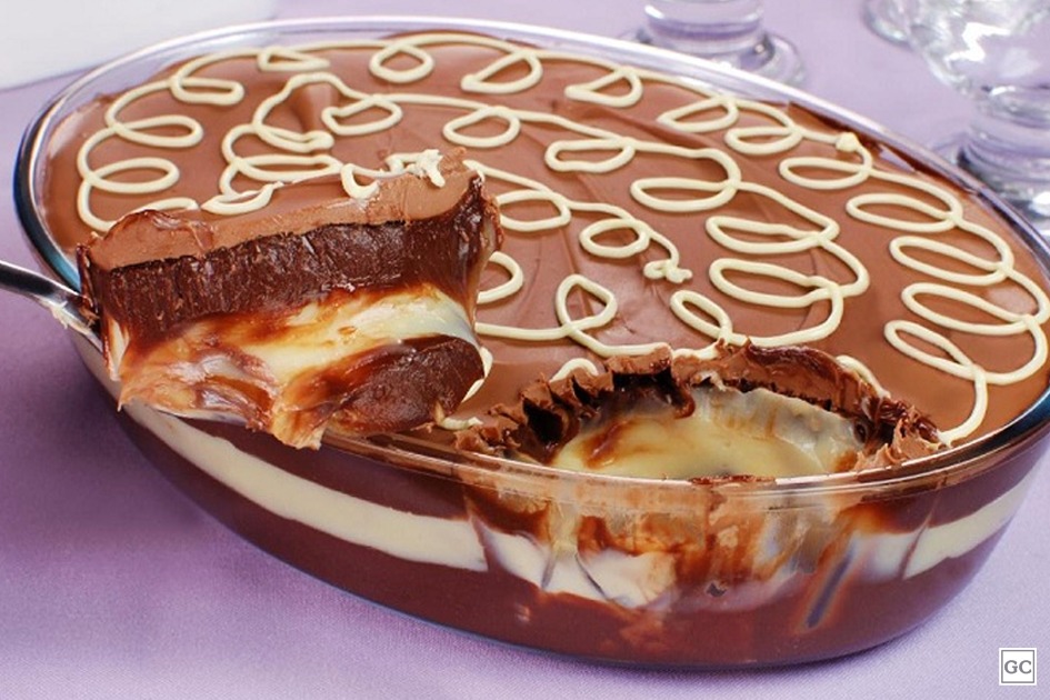 Faça um brigadeiro branco com o leite condensado e a manteiga até começar a soltar do fundo da panela; desligue e misture metade do creme de leite. Coloque em uma travessa. Derreta o chocolate (meio amargo e ao leite) no micro-ondas de 30 em 30 segundos, misture o restante do creme de leite para fazer uma ganache e cubra o brigadeiro branco. Decore com raspas de chocolate e leve à geladeira por 3 horas.