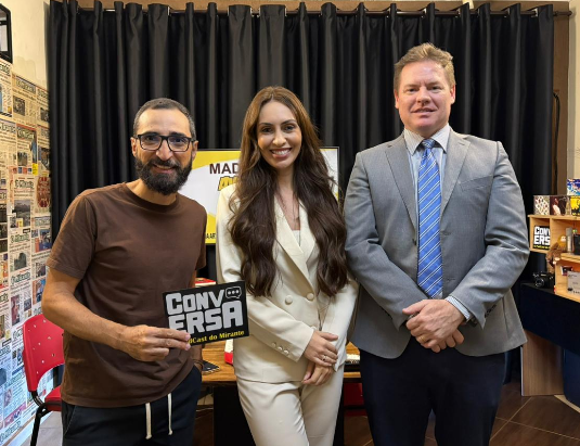 Advogados Soleane Lenara e Luiz Fernando Pizzo durante participação no Podcast Conversa sobre os direitos da mulher